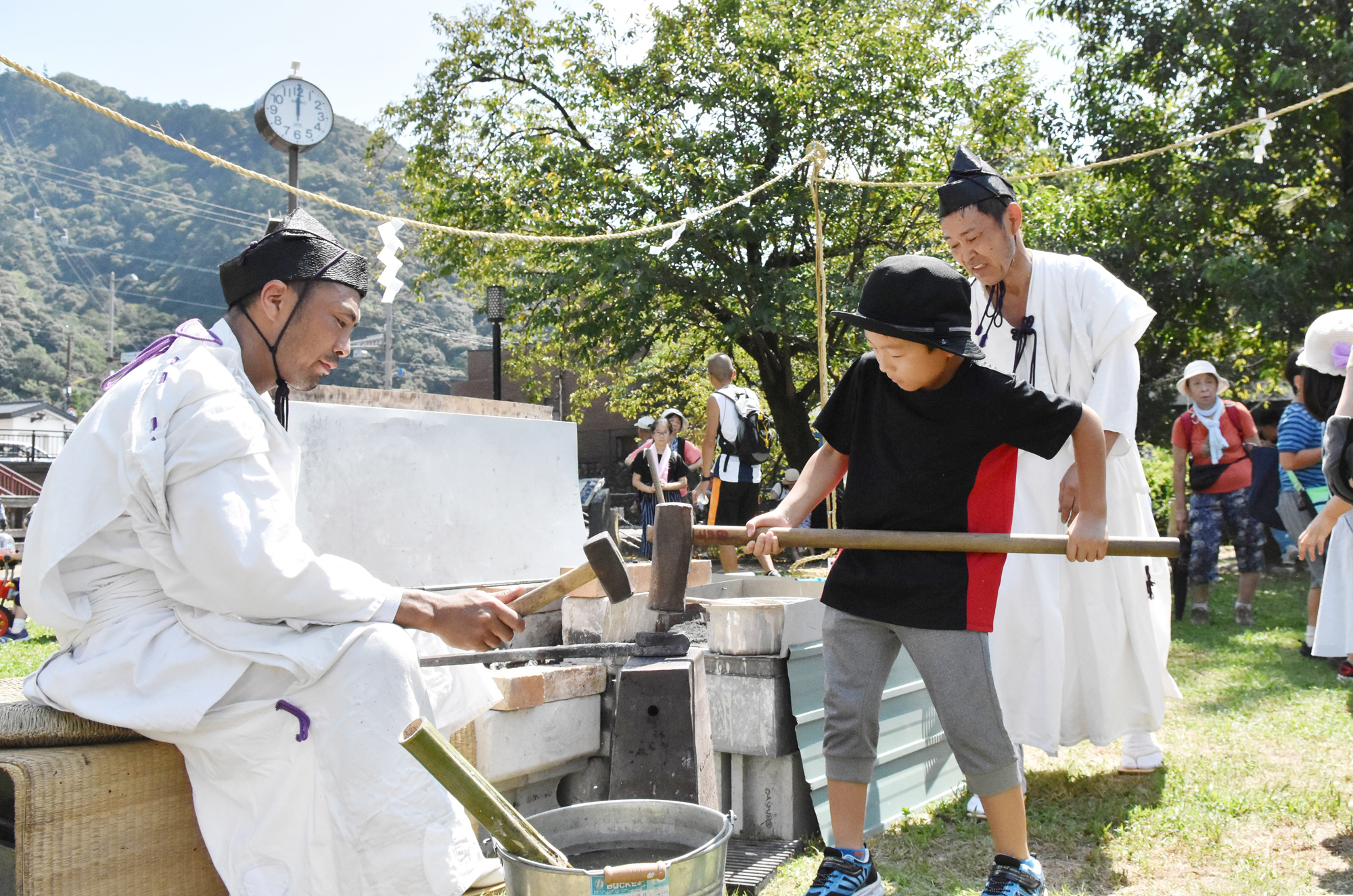 横座に座る刀匠の小槌と、脇に立つ体験者が大鎚で鉄を打つ「カンカンカン」という音が鳴り響きます。