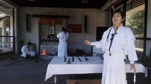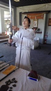 (写真右)本物の日本刀!『しのぎを削る』の説明をする吉田研さん