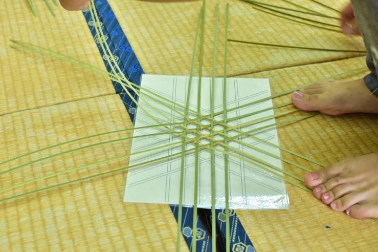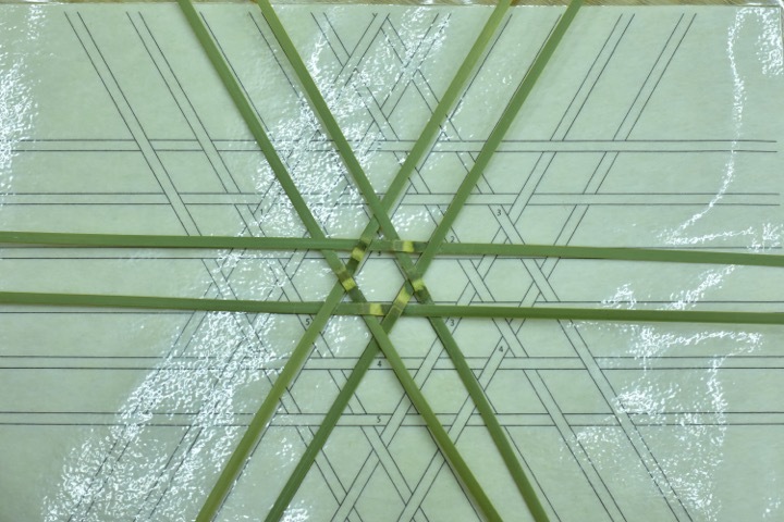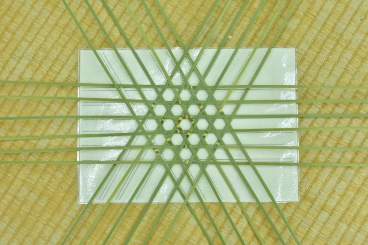 型紙に沿って編み込んでいくのですが、節の位置が辺の真ん中に来るようにするのがポイントだそうです。