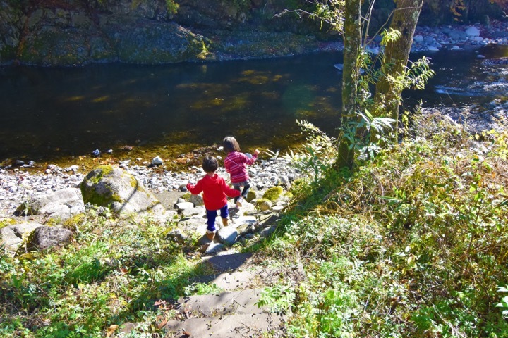 石階段で川岸まで降りられるようになっていて、子供たちはタッタッタ〜と下りていきます。