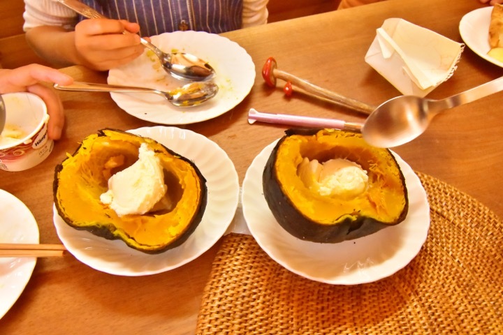 こちらは、丸ごと釜の中でじっくり焼いただけのかぼちゃ!中にバニラアイスを入れて食べると・・・