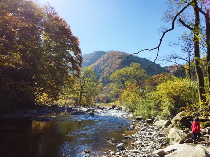 石を投げてみたり、探検してみたり、川に足をつけてみたり(かなり冷たいのに子供は平気)。