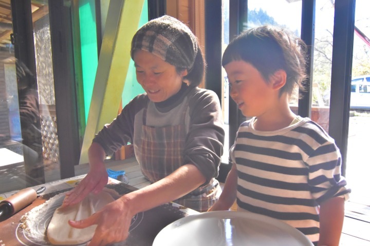 「まずこうやってね、少しずつ生地を伸ばしてね」と優しくレクチャー。楽しそうな息子。