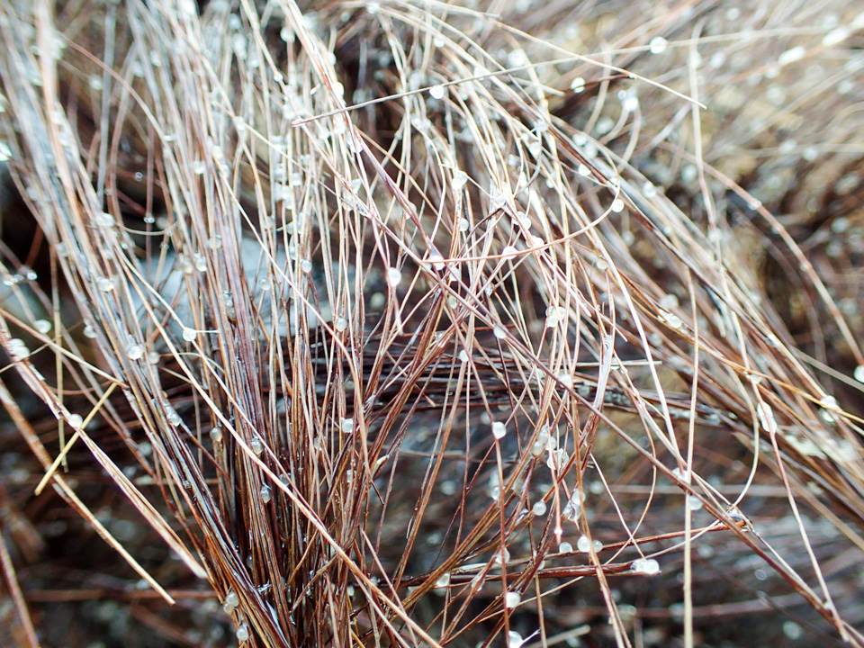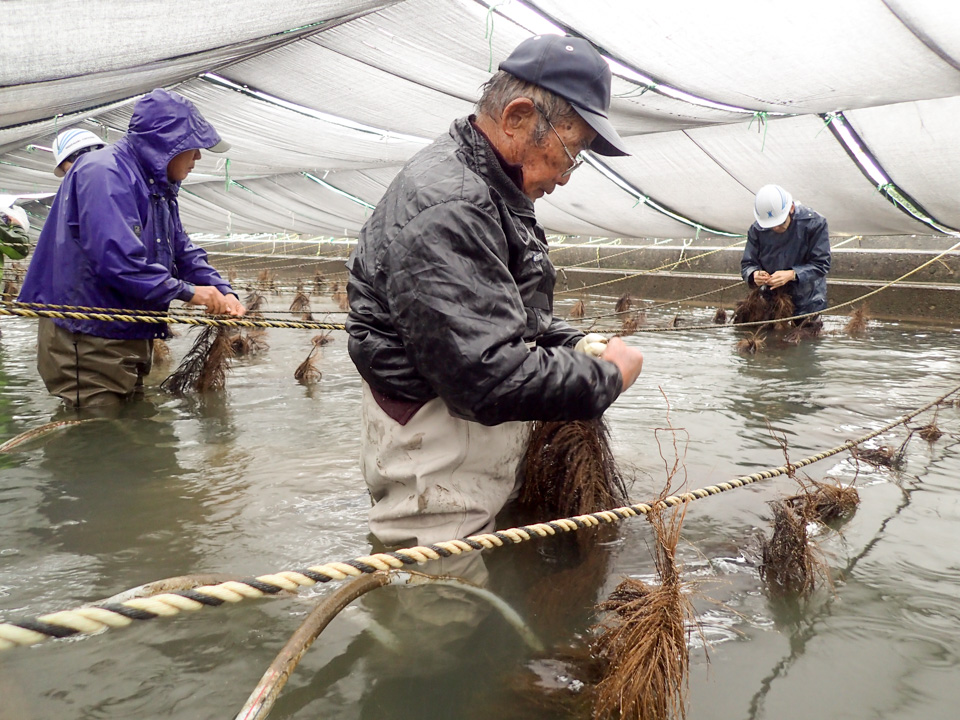 卵にオスから採取した精子を混ぜ合わせて受精卵をつくったら、川の水で満たした大きな容器に加えて攪拌します。そこにもじゃもじゃに伸びたシュロの樹皮を浸して、卵を付着させるのです。受精卵を少し足しては新たなシュロの樹皮をもぐらせていく。透明感のある小さな卵には、新たな命が宿っていました。