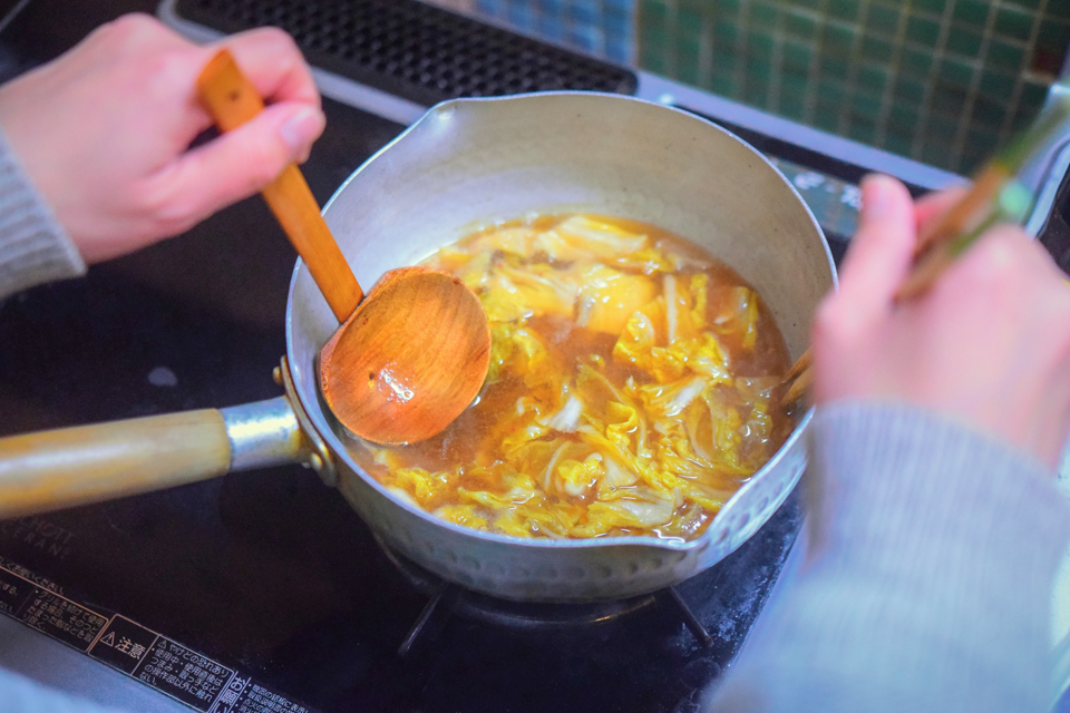 地元の家庭で定番のメニュー「味噌鍋」、またの名を「味噌煮」。2年近く熟成した、塩気の強い豆味噌「郡上味噌」と、煮干しだしの鍋に、切り漬けを投入。この相性が抜群なんです。少し漬かりすぎて酸っぱいくらいの切り漬けがあいます。塩分だらけになってしまうので、切り漬けは鍋に入れる前に水で塩抜きをします。あとはお好みの野菜やお肉(猪肉なんて最高!)を入れてクツクツ。